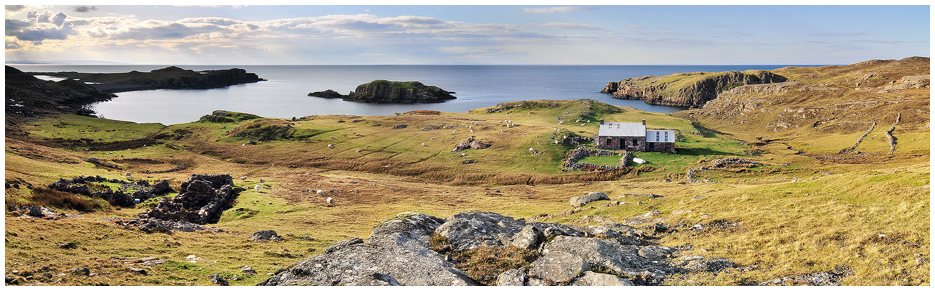 Sheep graze by the croft house at Camas a ghlais lean, which stands in a beautiful secluded location a mile north of Reiff, on the Rubha Mor peninsula.